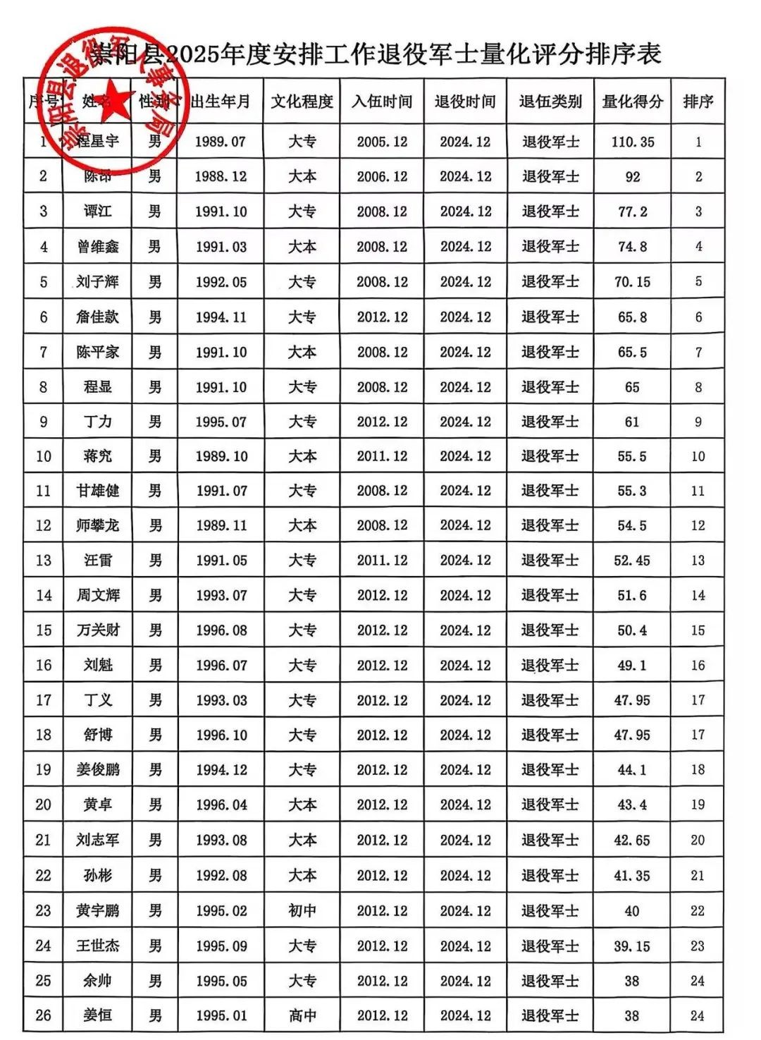 根据退役军人事务部、政治工作部印发的《安排工作退役军士和义务兵服现役表现量化评分办法》有关规定,经相关部门评定,并由崇阳县退役军人事务局对退役军士档案分别审核确认,现将2025年度安排工作退役军士服役表现量化评分情况公示如下: