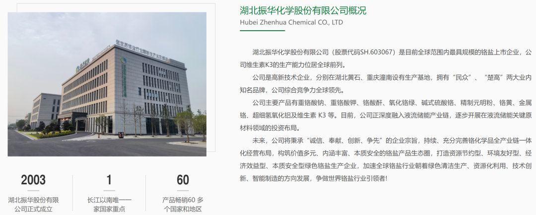 公开资料显示,振华股份成立于2003年6月19日,于2016年9月13日于上交所主板上市,公司位于湖北省黄石市。振华股份是国家重点铬盐生产骨干企业,主要从事铬盐系列产品的研发、生产与销售。主要有重铬酸钠、铬酸酐、晶体铬酸酐、液体铬酸酐、铬绿、重铬酸钾、碱式硫酸铬、维生素K3、元明粉、氢氧化铝等产品。