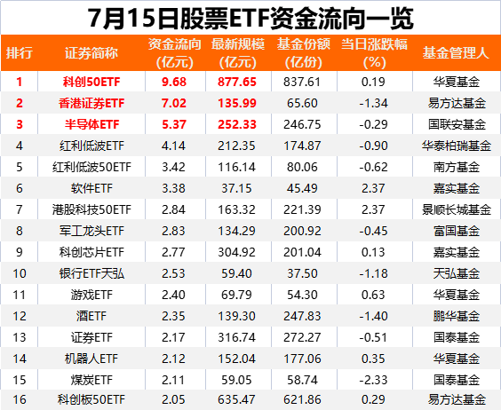 具体到指数维度,7月15日科创50指数ETF资金净流入居前,达13.43亿元。