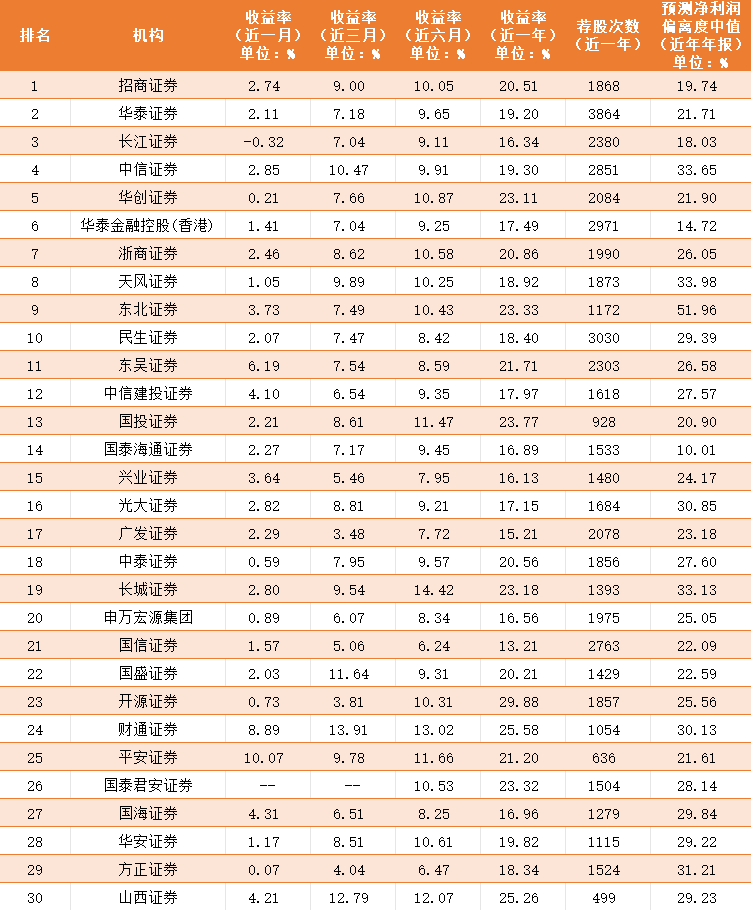 招商证券以近一年20.51%的收益率、1868次荐股次数稳居券商榜首位,其在消费、高端制造等领域的研报覆盖全面、质量突出,被机构投资者广泛引用;长江证券位列第三,近一年收益率16.34%,旗下高伊楠、马祥云等分析师在汽车、金融板块的研究形成协同效应,荐股组合表现稳健;浙商证券排名第七,近一年收益率20.86%,通过聚焦农业、科技等细分赛道,荐股精准度持续提升,成为中小券商中的佼佼者。