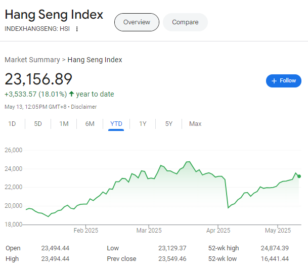 北京时间5月12日(周一),中美发布《中美日内瓦经贸会谈联合声明》,双方会谈取得实质性进展,同意大幅降低双边关税水平。受此重大利好刺激,港股恒生指数当天盘中飙升,科技股、消费股领涨,离岸中国资产午后也出现大涨,市场情绪迅速升温。