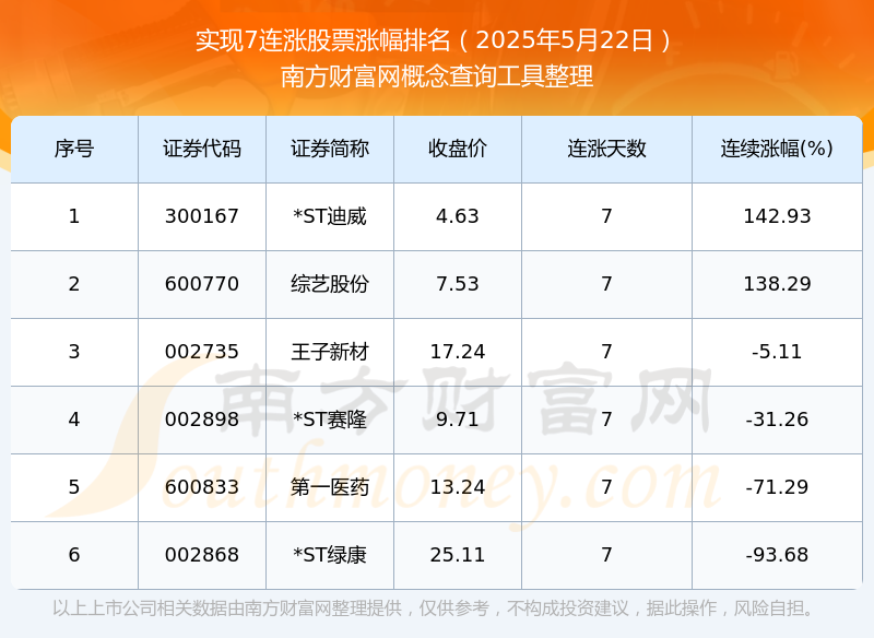 根据南方财富网概念查询工具数据统计,截止2025年5月22日收盘,共有6只个股实现7天连涨。其中连续涨幅较大的个股有*ST迪威、综艺股份、王子新材等,连续涨幅分别为142.93%、138.29%、-5.11%。
