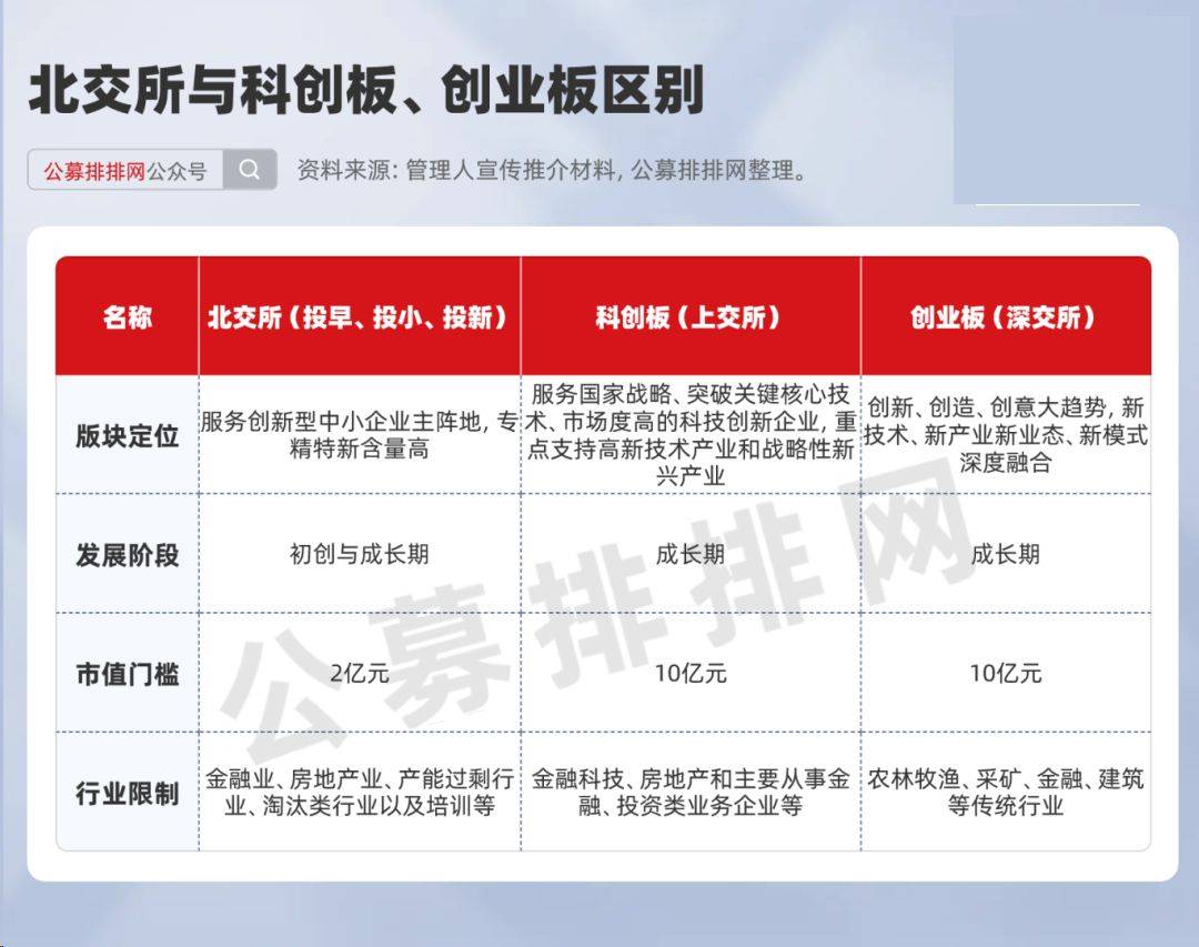 与科创板、创业板比较,北交所作为创新型中小企业主阵地,有更为友好的上市条件和灵活的交易规则,以及政策上的支持,与科创板、创业板错位发展,发挥金融改革“试验田”作用。