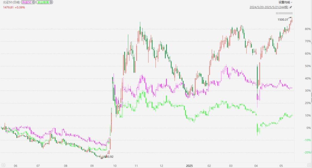 从估值来看,当前北证50整体市盈率(77.89倍)仍显著低于科创50(140.27倍)。从市场表现来看,去年9月24日以来,北证50已大涨146.73%,同期风格与北证50相似的科创50、创业板指涨幅为54.81%、34.94%。
