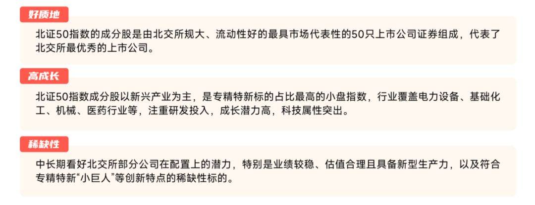 在这轮北证50创新高背后,除了指数弹性较大外,政策利好的集中释放激发了投资者的乐观情绪,推动指数上涨;加上北证50作为北交所的旗舰宽基指数,聚焦专精特新,代表性较强,标的稀缺性较高,指数自然水涨船高。