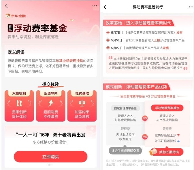国内公募基金行业迎来创新产品落地的重要时刻。5月27日,首批26只新型浮动费率基金中,16只正式启动发行,这批产品凭借“费率与业绩挂钩”的创新机制引发市场关注。京东金融等互联网财富管理平台同步上线相关基金,为投资者提供便捷认购渠道。