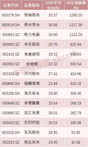 Wind数据显示,在2009年至2019年10年时间内,净资产收益率ROE(扣除/摊薄)连续超过15%的上市公司,A股有14家,分别是双汇发展、贵州茅台、海天味业、海康威视、格力电器、华东医药、洋河股份、承德露露、恒瑞医药、崇达技术、东风股份、福耀玻璃、东阿阿胶、金螳螂。
