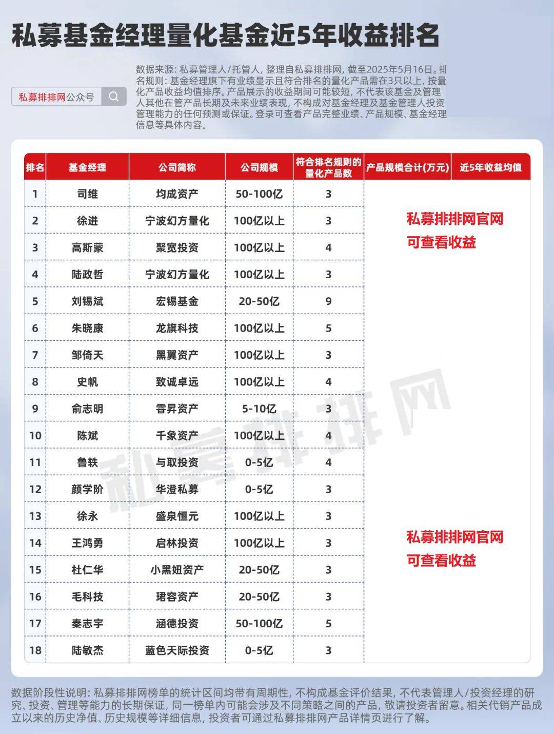 幻方量化徐进、陆政哲再次上榜,并位居前列。徐进管理的3只量化产品合计规模约为6.03亿元,近5年收益均值为***%,位居第2;陆政哲管理的3只量化产品合计规模约为8.37亿元,近5年收益均值为***%,位居第4。