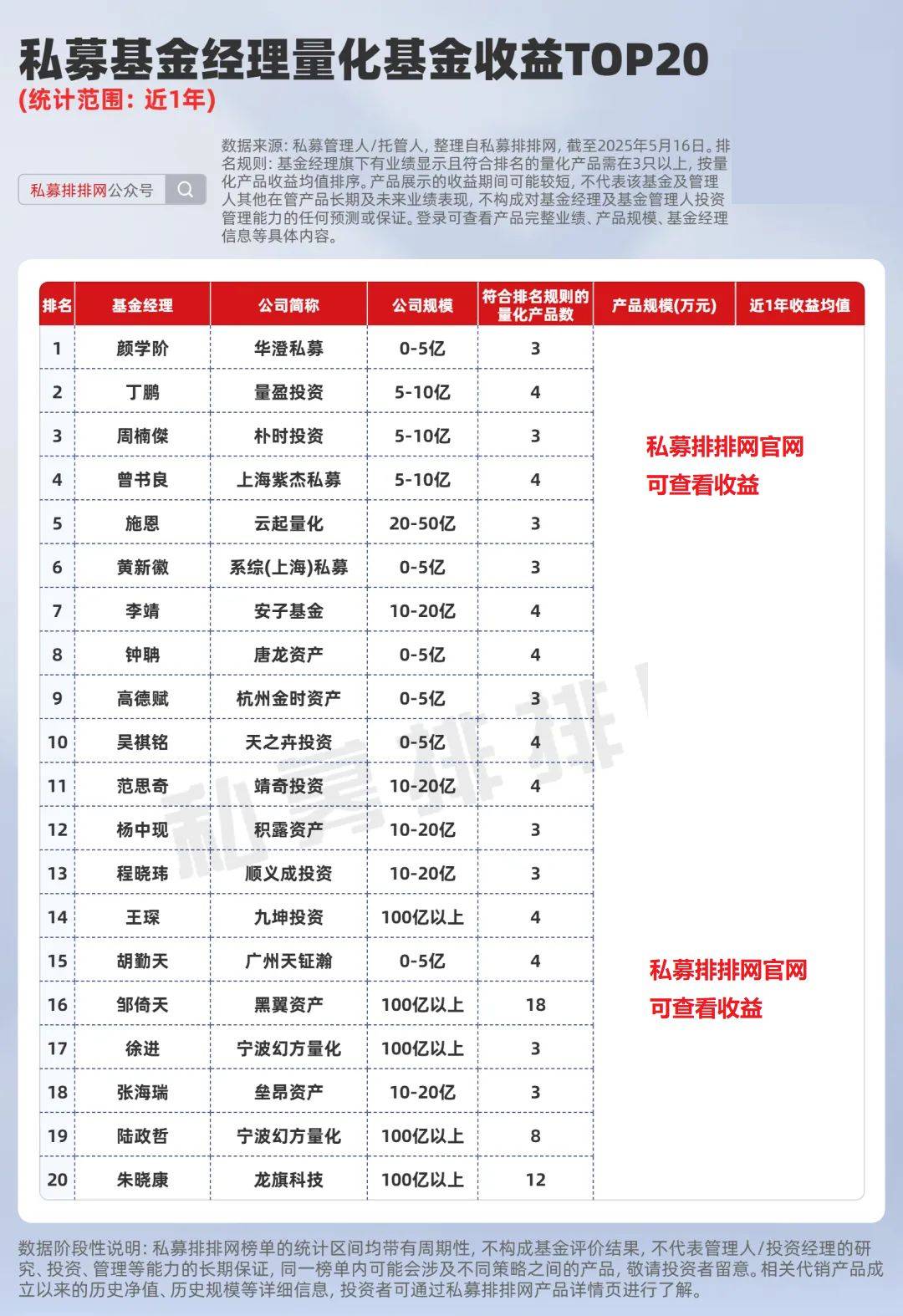 私募排排网数据显示,截至5月16日,有业绩显示的1302只量化产品,近1年收益均值为20.93%。在管量化产品近1年收益均值位居前三的基金经理分别是:华澄私募颜学阶、量盈投资丁鹏、朴时投资周楠傑。