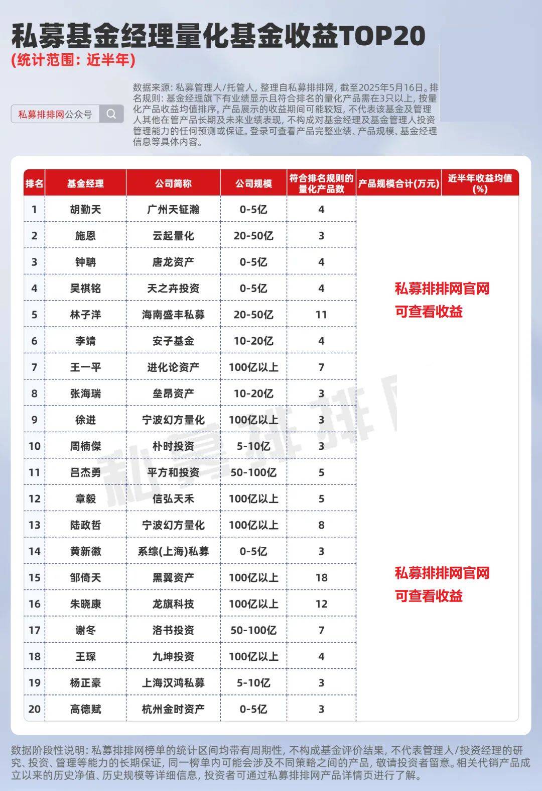 2020年发展至今,量化的爆发期已走过了近5年的时间,让我们来看看近5年的时间里,哪些量化基金经理的产品业绩表现较为领先。为了给予投资者更有价值的信息,本文将按照近半年、1年、3年、5年四个时间维度,分别筛选出旗下量化产品收益均值前20的私募基金经理,供投资者参考。(排名规则:在管有业绩显示的量化产品在3只以上,按量化产品收益均值排序)