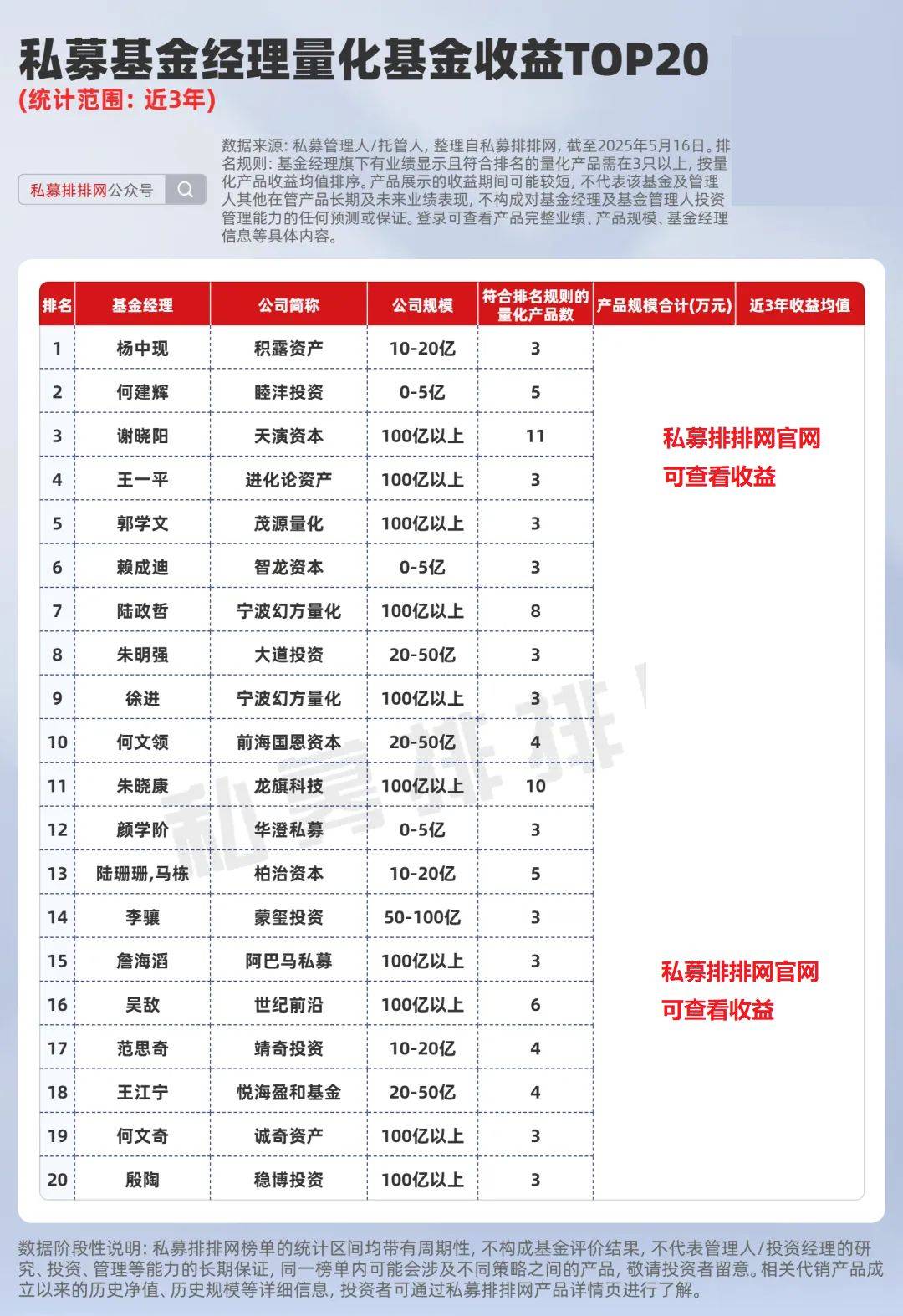 上榜的百亿私募量化基金经理有10位,其中天演资本谢晓阳管理的11只量化产品合计规模约为16.10亿元,近3年收益均值为***%,位居第3。