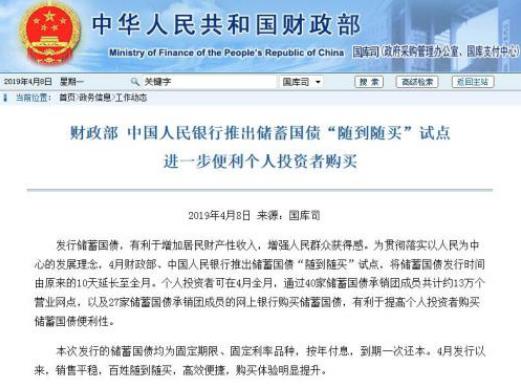 据财政部网站消息,财政部、中国人民银行4月推出储蓄国债“随到随买”试点,将储蓄国债发行时间由原来的10天延长至全月。
