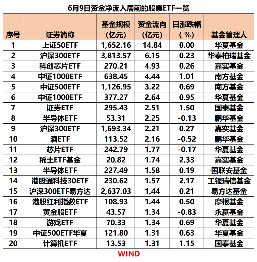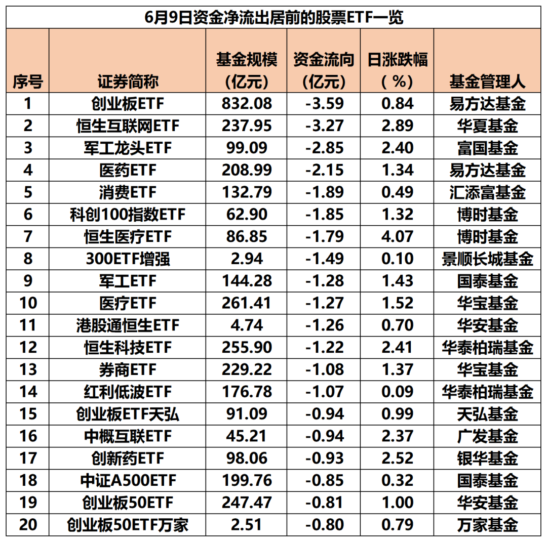 6月9日,市场全天震荡走高,创业板指领涨。医药股爆发,大金融板块活跃。股票ETF(含跨境ETF)整体资金净流入超25亿元,其中,上证50、沪深300、中证1000、中证500等指数相关宽基ETF成为“吸金”主力,军工龙头ETF、医药ETF、消费ETF等热门主题ETF资金净流出居前。
