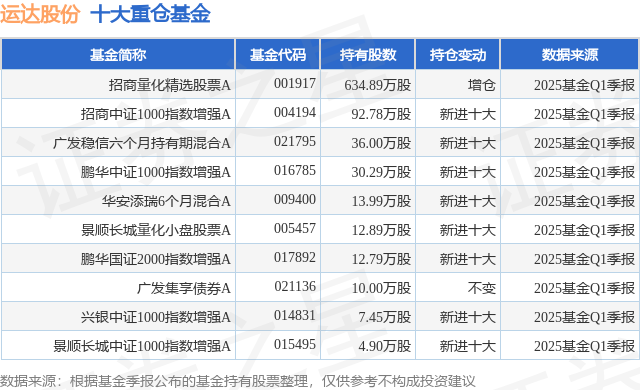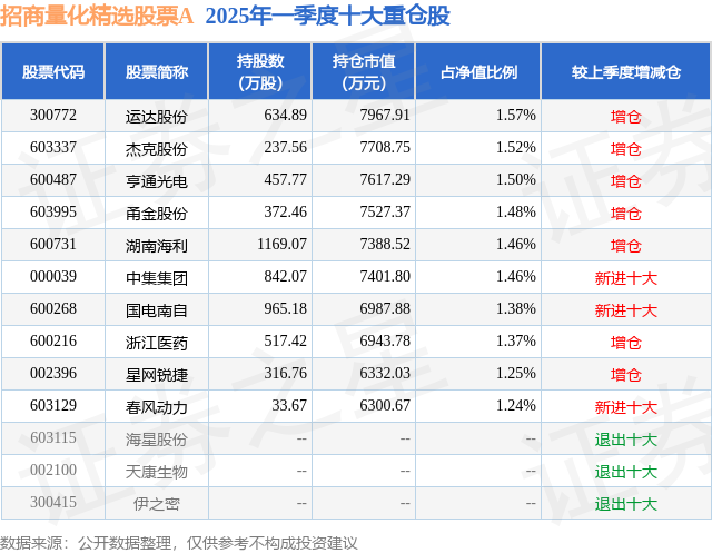根据2025基金Q1季报公募基金重仓股数据,重仓该股的公募基金共11家,其中持有数量最多的公募基金为招商基金的招商量化精选股票A。招商量化精选股票A目前规模为26.94亿元,最新净值2.7841(6月13日),较上一交易日下跌1.18%,近一年上涨27.44%。该公募基金现任基金经理为王平。王平在任的基金产品包括:招商沪深300指数增强A,管理时间为2017年2月10日至今,期间收益率为54.31%;招商中证红利ETF,管理时间为2019年11月28日至今,期间收益率为93.11%;招商中证光伏产业指数A,管理时间为2021年6月18日至今,期间收益率为-54.39%。