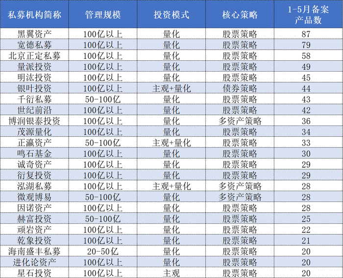 表格:今年1-5月备案数量不少于20只的私募名单数据来源:私募排排网、界面新闻整理