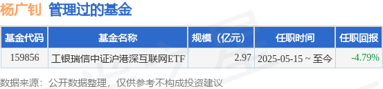 杨广钊先生:硕士研究生,中国国籍。2021年加入工银瑞信,曾任指数及量化投资部量化研究员,现任指数及量化投资部基金经理。2025年5月15日起担任工银瑞信中证沪港深互联网交易型开放式指数证券投资基金的基金经理。