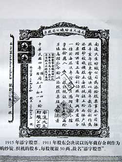 张謇曾对人说:“我们儒家,有一句扼要而不可动摇的名言‘天地之大德曰生’。这句话的解释,就是说一切政治及学问最低的期望,要使得大多数的老百姓,都能得到最低水平线上的生活”。因此,他把自己创办的企业命名为“大生”,就是“天地之大德曰生”的涵义。如果说,张謇的这种做法,是秉持他自己的信念,那么,创办这些企业和社会公益事业的资金从何而来?除向社会筹集外,将企业经营利润转为股份,壮大自身实力和竞争力量,争取获取更多利润兴办更多实业和社会公益事业是张謇的主要办法。这张“中华民国”4年发行的“南通大生纺织公司股票”,票面文字中有“南通大生纺织公司为添给股票事,本公司按照辛亥年股东会议决,以历年截存余利作为添购纱锭织机股本,每股规银五拾两,按户填给……”的字样,就是张謇将企业利润转为企业股票的见证。因此,票面中有“添字第……号”的排号,这种股票也被称为“添字股票”。这种以截存企业利润转为股份被称为“添字股票”的事例,在中国近代是很有特色的一种股票。
