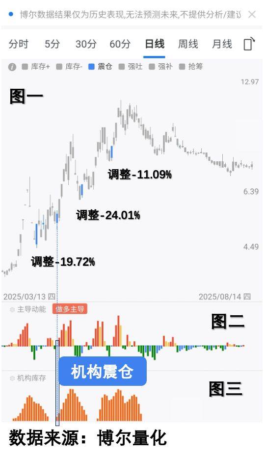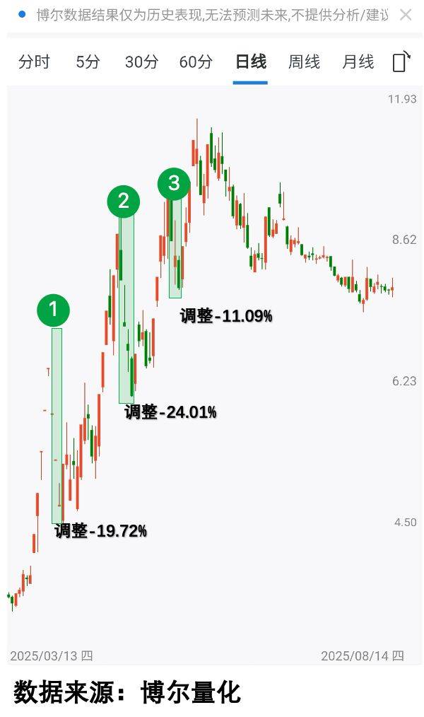 上图这只四个月翻倍的牛股,用三次超过20%的调整完美演绎了慢牛快调的残酷。第一次调整时我像多数人一样止损出局,第二次学乖了死扛,结果第三次直接被30%的跌幅击穿心理防线。直到接触量化数据后才发现,那些让我夜不能寐的暴跌,在机构眼里不过是例行公事的震仓。