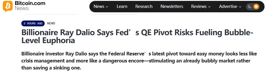 达利欧的警告基于一个简单但不祥的逻辑:当美联储扩大其资产负债表、降低利率,并且在财政赤字膨胀的情况下,它实际上开始在货币化政府债务。