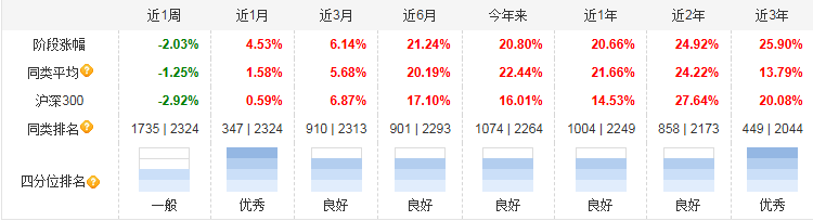 从过往表现来看,一定程度上体现了它的投资潜力。近1周上涨幅度为4.53%;近3月上涨幅度为6.14%;近6月上涨幅度为21.24%;近1年上涨幅度为20.66%;近2年上涨幅度为24.92%;近3年上涨幅度为25.9%;近5年上涨幅度为27.75%;今年来上涨幅度为20.8%。从2017年8月24日至今,上涨幅度未70.47%。